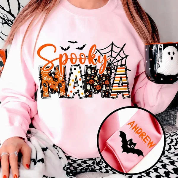 Personalized Spooky Mama Grandma Pumpkin Bat Design Crewneck Sweatshirt with 1-8 Names Halloween Costume Gift for Women
